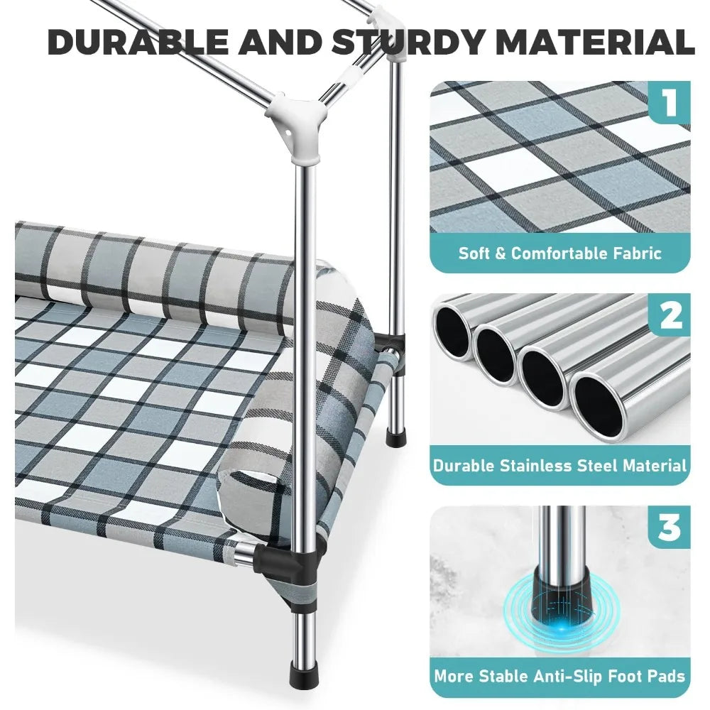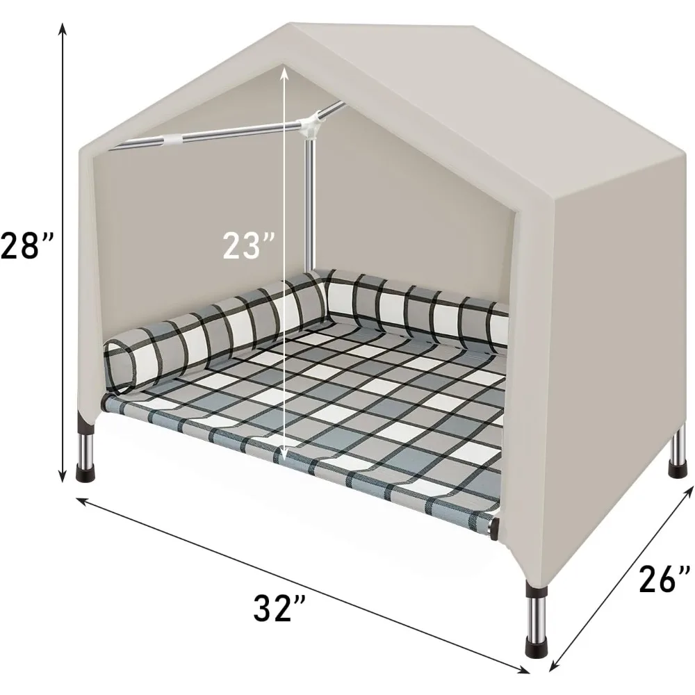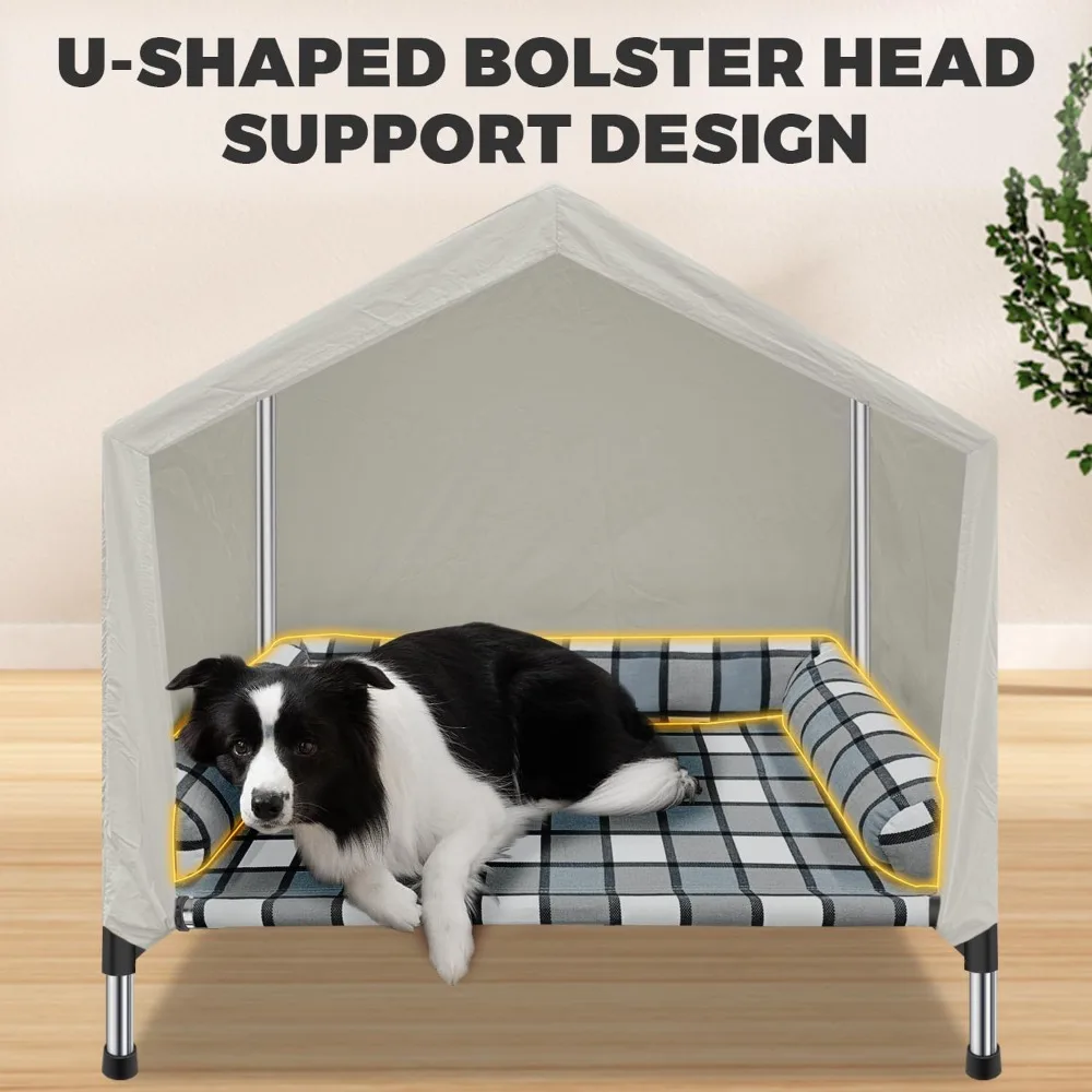 This product is a versatile 2-in-1 elevated dog house that provides a comfortable pillow bed and a tent cover for your pet. It's designed to keep pets warm and dry, offering protection from cold floors, wind, sun, and rain, making it suitable for all seasons and weather conditions. The dog bed is crafted with soft, skin-friendly fabric and features a U-shaped pillow that offers excellent head support, reducing spinal pressure and improving sleep quality. It's suitable for dogs of all sizes and ensures a comfortable resting place. The tent cover is windproof, waterproof, and sunproof, with a breathable design that promotes airflow for cool comfort. This makes it ideal for outdoor adventures or simply relaxing in the backyard. Assembly is straightforward and quick, with a detailed instruction manual and well-organized parts, making it easy for anyone to set up a cozy resting space for their pet. This pet house is not just functional but also stylish, fitting well in various settings such as camping, the beach, backyard, or living room, providing a cozy and comfortable spot for your pet.