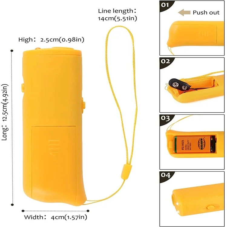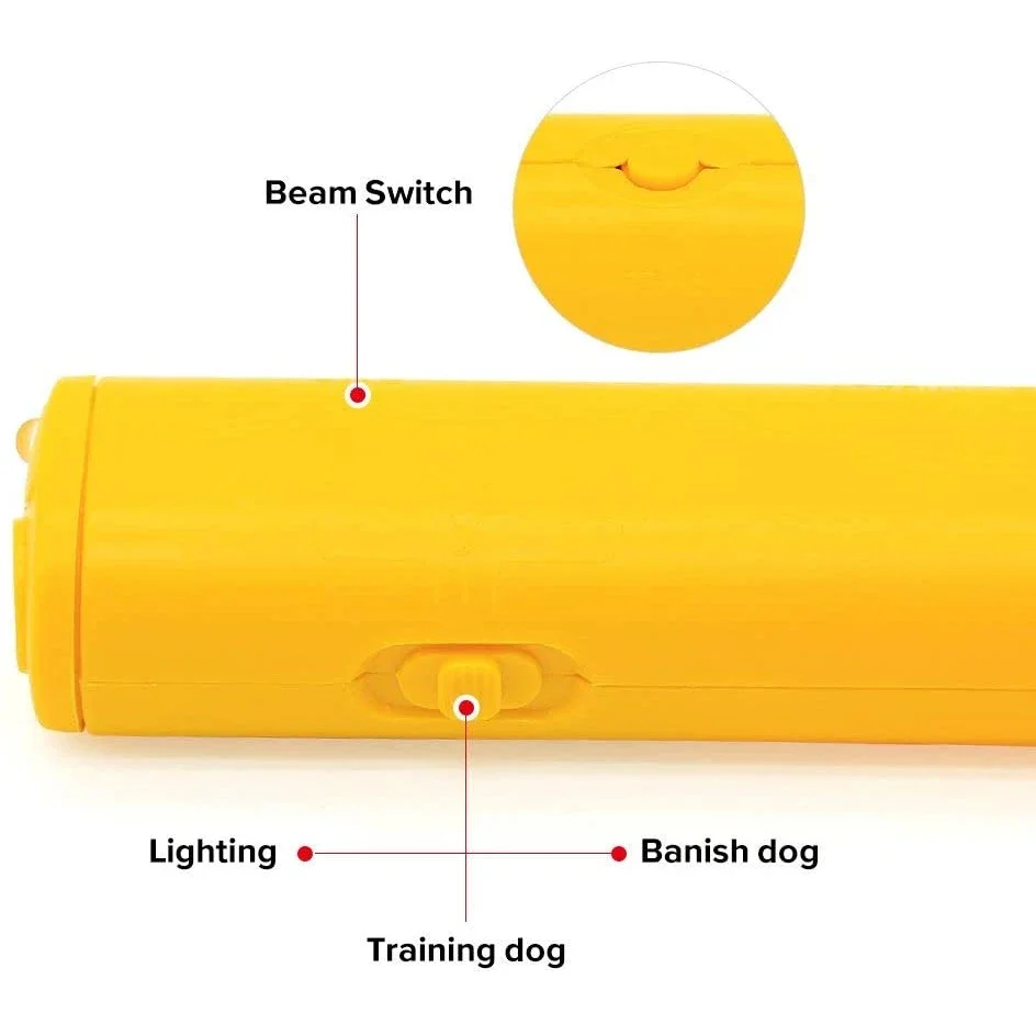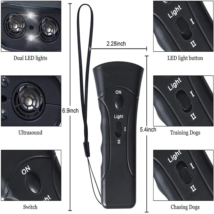 The trainer is based on the theory that ultrasound (ultrasonic wave reaches up to 125db) is above the upper limit of human hearing and super ultrasonic and 28000mcd strong white light. It can activate visual and additive activation to dogs, cats and other animals, but there will be no effects on people. There are three modes for use: Training dog , Banish dog , Illuminating.